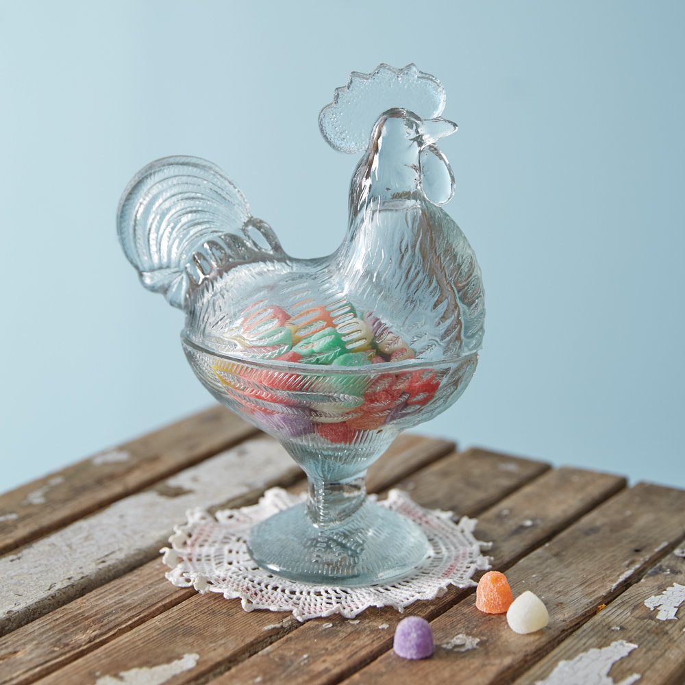 This rooster dish didn't come from your grandmother's cabinet! Our vintage-inspired rooster will add an elegant touch to a spring table or farmhouse decor. Feature your favorite treats inside its covered dish. Item is created with glass and is food safe.