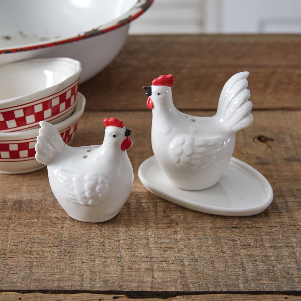 Your next gathering just became more endearing with our Ceramic Rooster Collection. Spice up your tables and food with our Hen and Rooster Salt and Pepper Shakers. These shakers are displayed on an egg plate. This item is made of ceramic and features rubber stoppers. Item is food safe. Please wash before use. The smallest shaker measures 2''W x 2½''D x 3''H and the egg plate measures 4¼''W x 3''D x ¼''H.