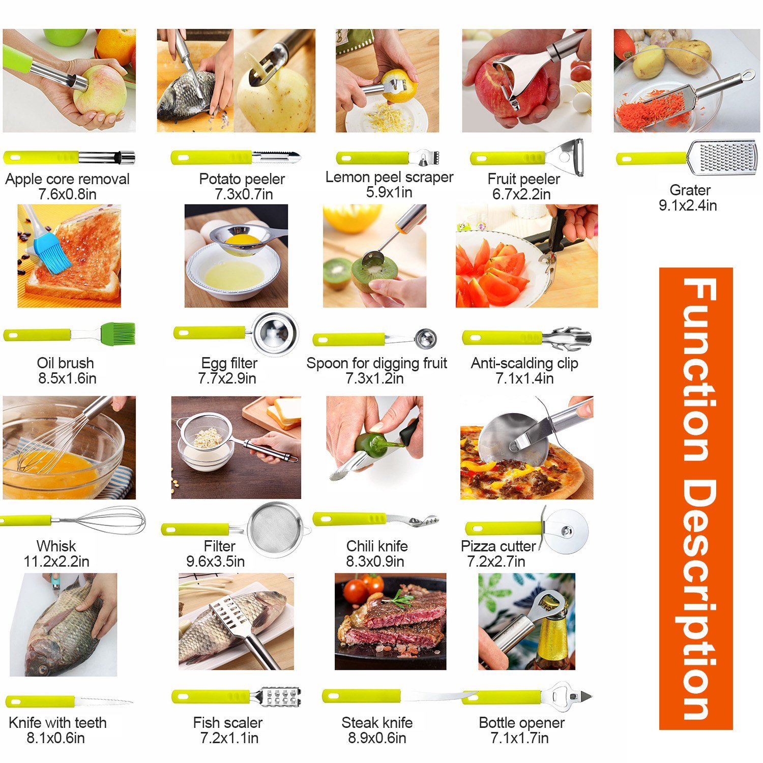 34 Pcs Kitchen Cooking Utensils Set Stainless Steel Kitchen Gadget Tools Core Removal Potato Peeler Whisk Pizza Cutter Steak Knife Bottle Opener